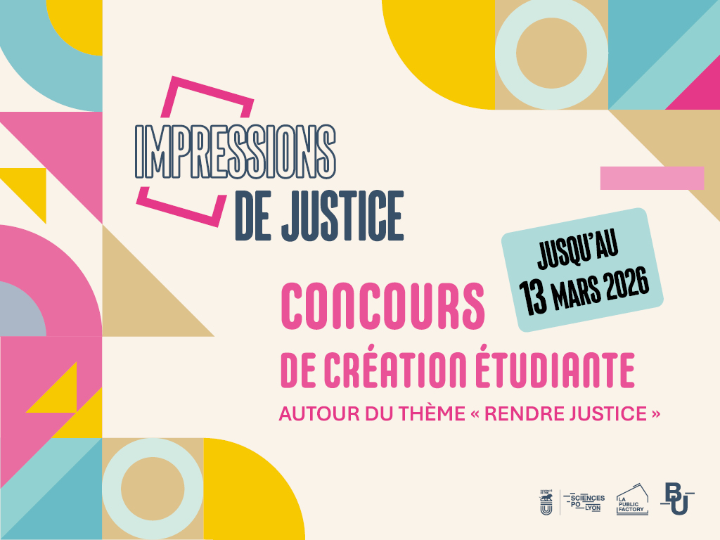 [IMPRESSIONS DE JUSTICE] CONCOURS DE CRÉATION ÉTUDIANTE La bibliothèque de Sciences Po Lyon et la Public Factory vous proposent une expérience originale qui mêle art, engagement et réflexion sur la justice : Impressions de justice. Photo, dessin, gravure, slogan, collage… représentez votre vision de l’expression “rendre justice” et intégrez l’illustrathèque de la bu ! • Le thème […]